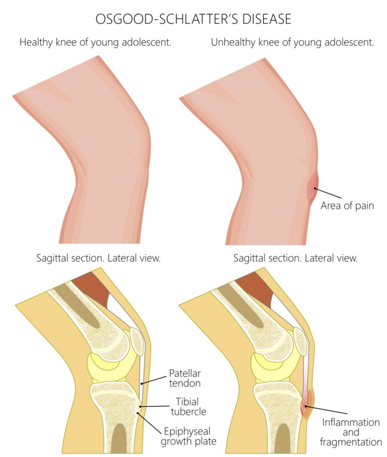 In adolescents the predominant age for suffering is between 12 and 15 years in boys and between 8 and 12 years in girls, coinciding with periods of growth spurts with boys more affected than girls. OSD is common in teens who play soccer, basketball, and volleyball, and those who participate in gymnastics.
