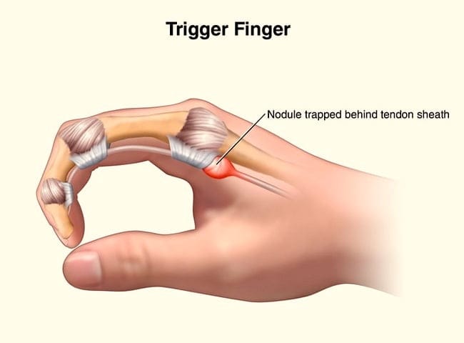 Trigger finger occurs if there’s a problem with the tendon or sheath, such as inflammation and swelling. As a result, the tendon can no longer slide easily through the sheath and can bunch up to form a small lump (nodule). This makes bending the affected finger or thumb difficult.